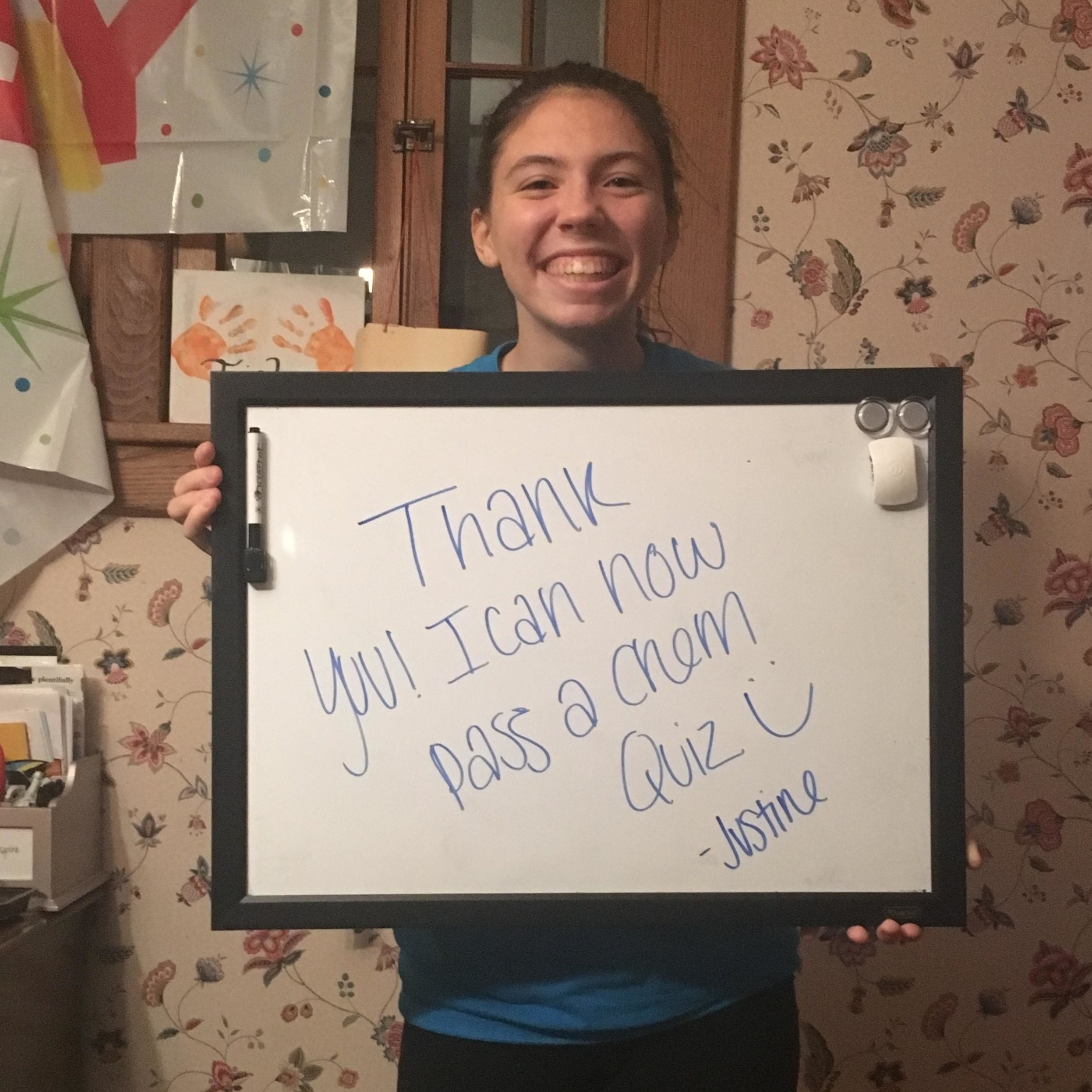 “Thank you! I can now pass a Chem Quiz :)” -Justine, 11th Grade AP Chemistry Student